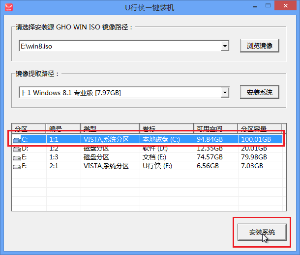 选择好原版Win8系统镜像后,选择要安装的盘符(一般是C盘),之后我们点击 “安装系统” 按钮开始安装原版Win8系统,如下图所示: